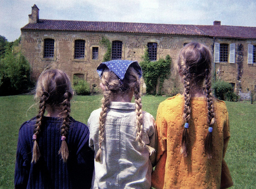 J’aime bien cette image, sa composition comme son caractère énigmatique. Face à cette photographie, je ne peux m’empêcher de me livrer à mon tour une tentative de décodage. L’absence de titre comme l’appareil utilisé m’aiguillent vers une prise de vue familiale qui a dévié, plutôt que vers une mise en scène soigneusement préparée. J’imagine l’occasion d’une photographie de groupe, modifiée de façon impromptue lorsque l’auteur remarque que les fillettes portent toutes trois une coiffure similaire. Il s’agirait alors d’un “portrait avec tresses”, dont la spontanéité relative est compatible avec la profondeur de champ ordinaire d’un compact à petit capteur.