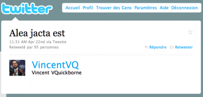Voici le tweet envoyé à 11h31 ce jeudi 22 avril par Vincent Van Quickenborne (@VincentVQ) à l’issue de la réunion de l’Open-VLD. Le président de son parti, Alexander De Croo (@alexanderdecroo) prendra quelques minutes plus tard la parole devant les journalistes pour annoncer que son parti sortait du gouvernement, provoquant sa chute et forçant le premier Ministre Yves Leterme (@YLeterme) à remettre sa démission au Roi.