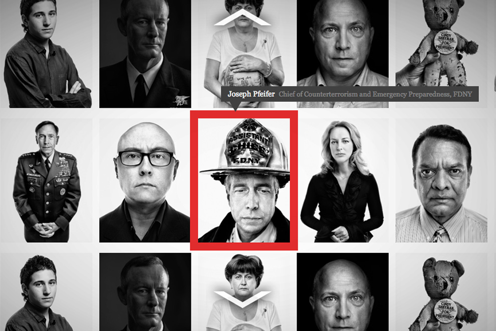 Time Magazine, fidèle à son travail graphique de haute volée a de son côté produit l’application “Portraits of Resilience“. 40 portraits de femmes et d’hommes – familles de victimes, pompiers, artistes, militaires (dont le Général Petraeus) et politiques (dont Georges W Bush) – présentés dans une mise en scène simple, classieuse et très efficace en HTML5.