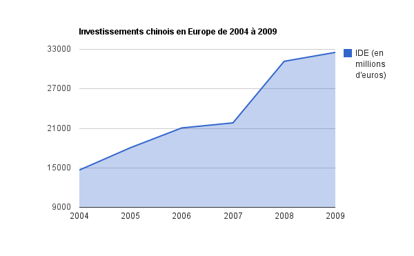 Mais leur rythme de croissance donne le tournis. Relativement stables jusqu’en 2004, les investissements chinois ont été multipliés par treize en l’espace de six ans. Si aucune donnée européenne postérieure à 2009 n’est disponible, on peut toutefois avancer que leur croissance n’a fait que s’accélérer. Pour les seuls six premiers mois de l’année 2011, les acquisitions d’entreprises en Europe occidentale ont déjà été cinq fois plus importantes [en] que pour la totalité de l’année 2010.
