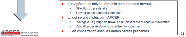 Pour l’Arcep, la répartition des tâches est claire : “les opérateurs doivent être mis au centre des travaux”, peut-on lire en conclusion d’une présentation en date du 30 novembre 2011. Ils choisiraient le prestataire en charge des mesures sur le réseau. Et seraient responsables des “travaux sur le référentiel commun”, qui, peut-on lire plus tôt dans le document, spécifie “précisément les mesures à effectuer”.