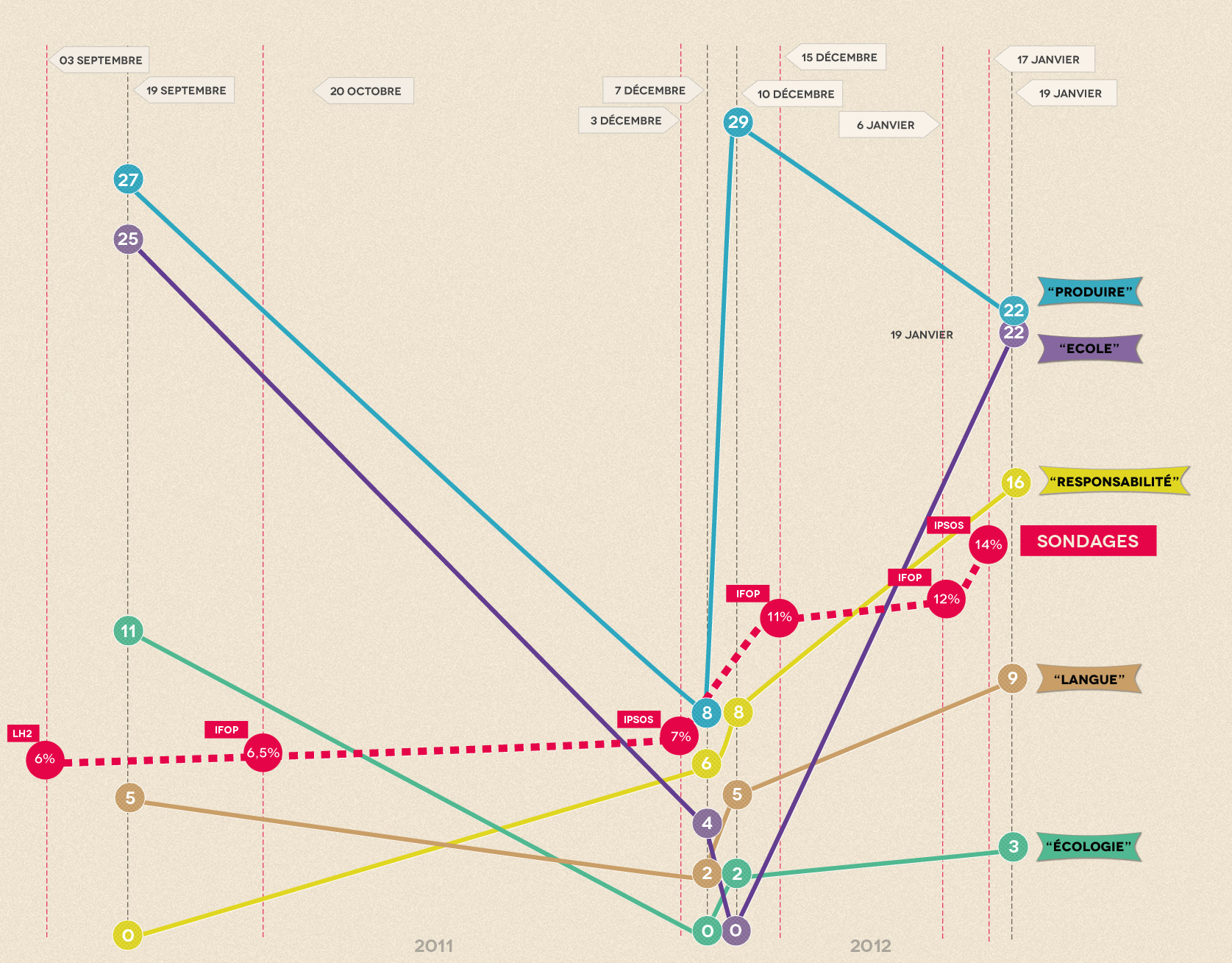 Dans les discours qui vont suivre sa candidature du 7 décembre, l’école ne réapparait plus, jusqu’au 19 janvier. Dans le même temps, la courbe des occurrences du terme “responsabilité” augmente sensiblement et de la même façon que le pourcentage d’intention de vote au premier tour. Alors qu’il pointe du doigts les précédents gouvernements et les différents candidats et partis, il récupère 5 % des intentions de vote, passant de 7 à 12 %. Et parallèlement à ce constat, les mots “France” et “pays” prennent de moins en moins de place.